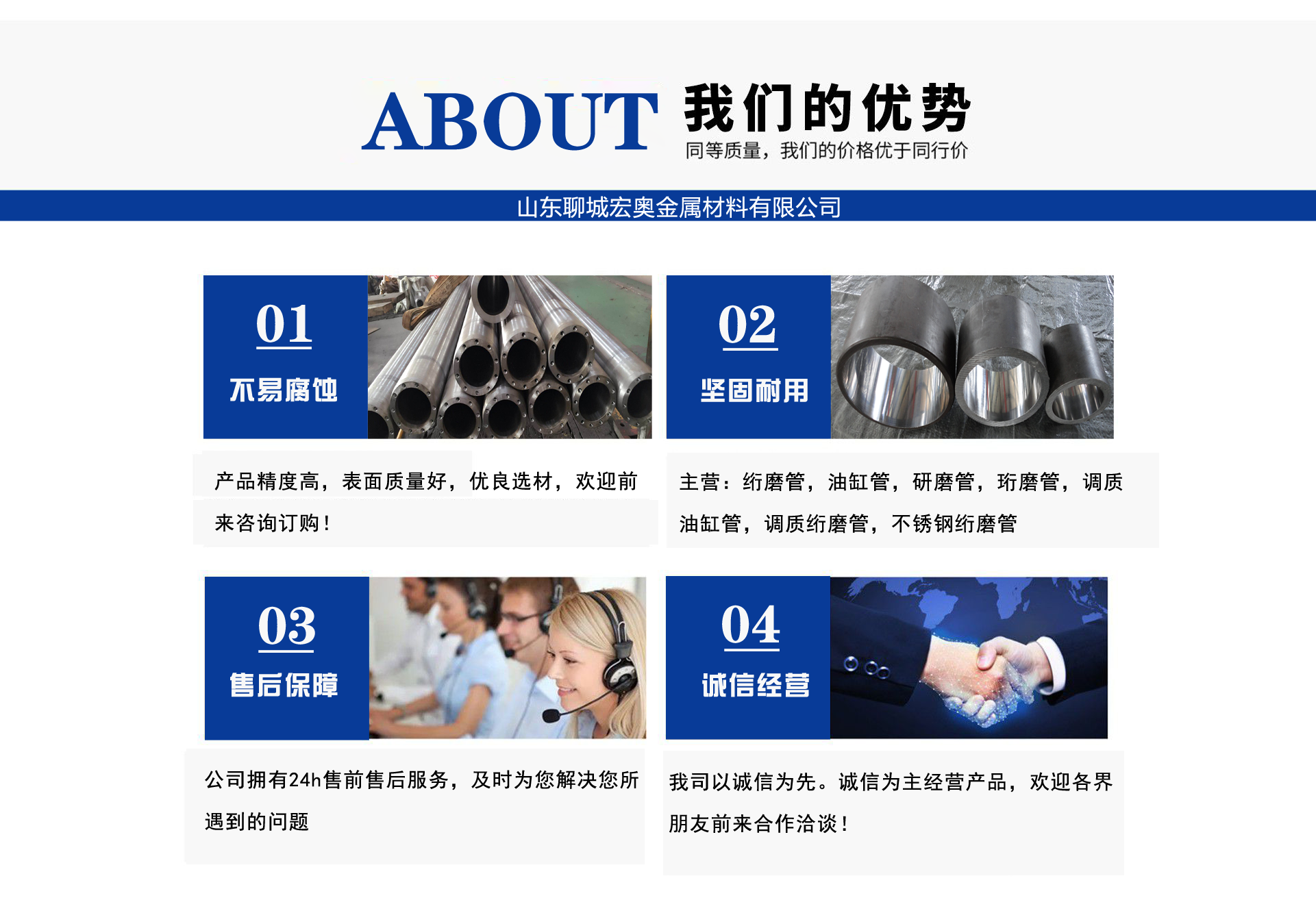 山東聊城宏奧金屬材料有限公司位于風(fēng)景秀麗的江北水城-聊城。地理位置優(yōu)越,交通便利。主營(yíng)絎磨管,油缸管,研磨管,珩磨管,調(diào)質(zhì)油缸管,調(diào)質(zhì)絎磨管,不銹鋼絎磨管等產(chǎn)品 廣泛應(yīng)用于礦山、起重、船舶、煤炭、運(yùn)輸、化工、科研、軍工等工業(yè)領(lǐng)域。 公司憑借雄厚的實(shí)力,豐富齊全的規(guī)格品種,完善的質(zhì)量保證,合理的價(jià)格,優(yōu)質(zhì)的服務(wù),不斷地受到新老用戶(hù)及業(yè)內(nèi)人士的肯定和信任,我們本著及用戶(hù)之所及,想用戶(hù)之所想的服務(wù)宗旨不斷地拼搏,進(jìn)取,在此對(duì)多年來(lái)支持我們的各行各業(yè)的新老朋友表示由衷的感謝,愿我們今后的合作更加愉快! 歡迎國(guó)內(nèi)外新老客戶(hù)來(lái)公司視察、蒞臨指導(dǎo)工作!...